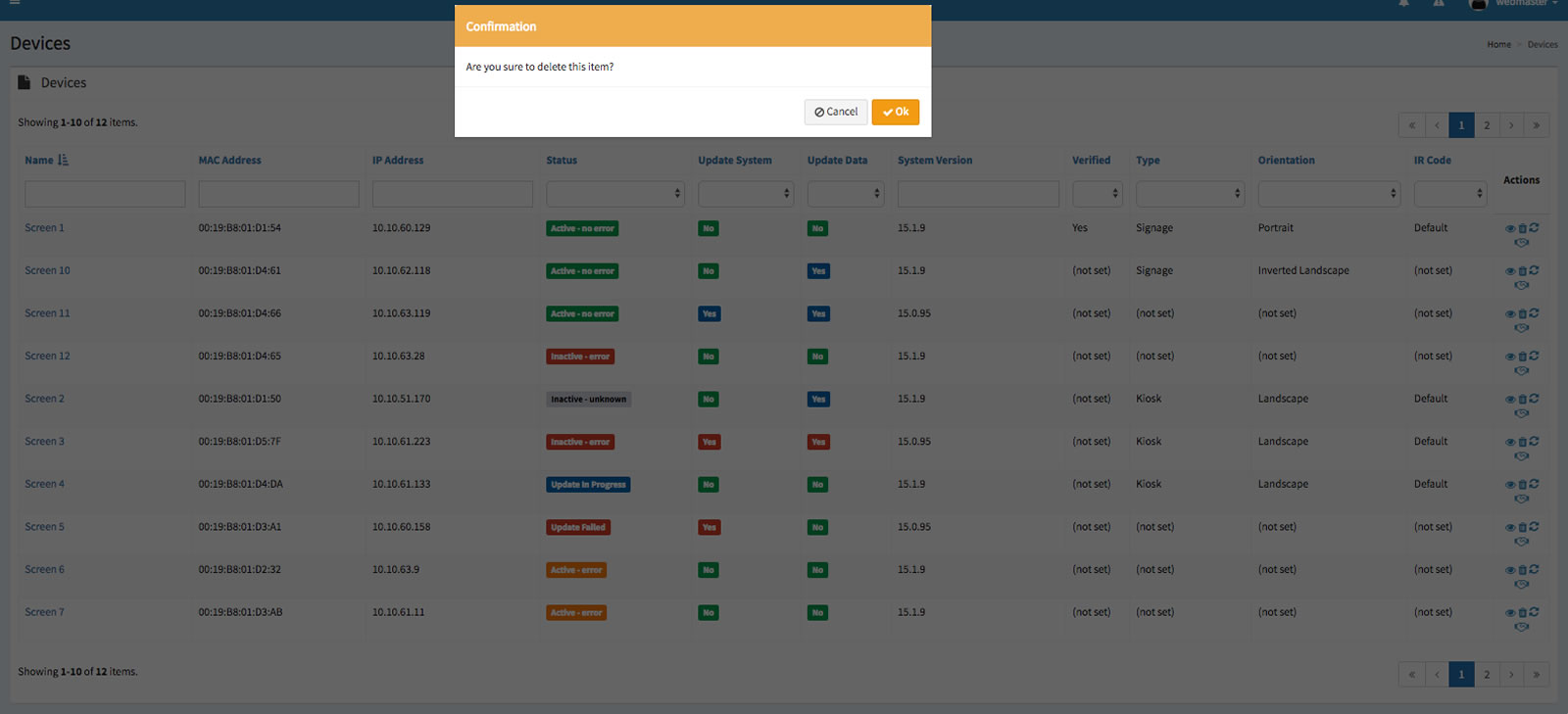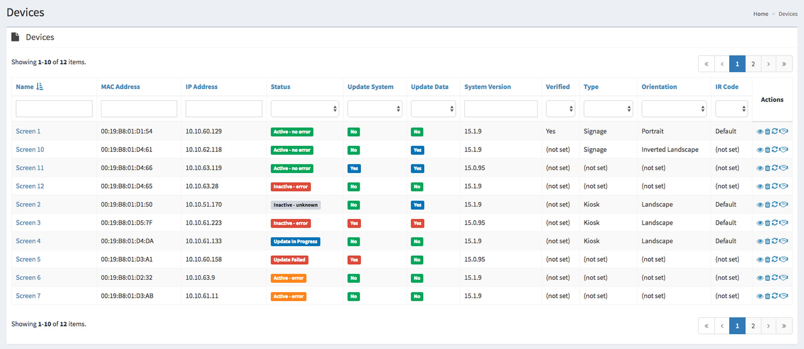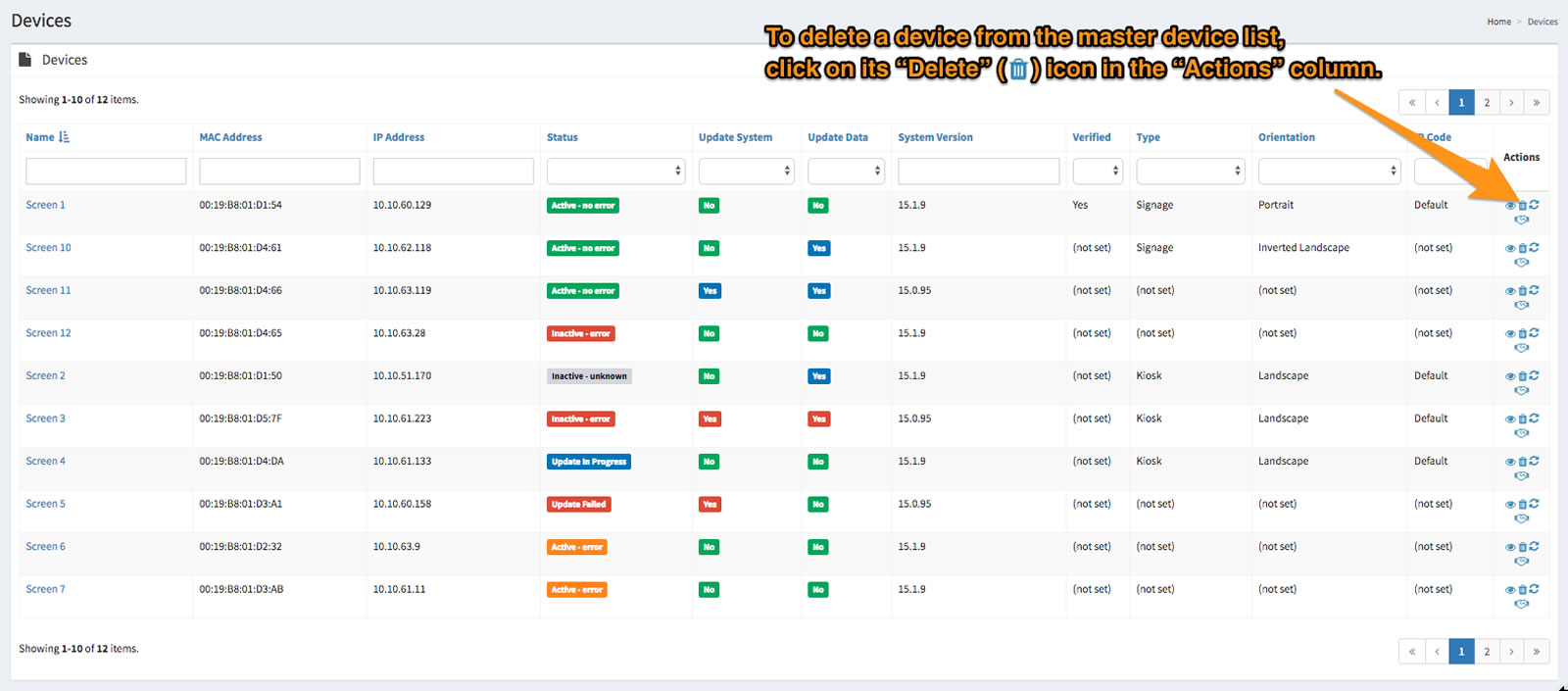 To view devices, select Devices → Manage from the left column menu. This will display the master list of devices: