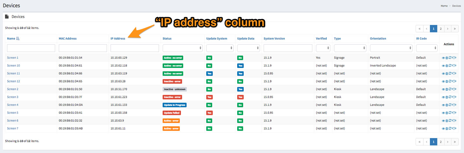 You can also get a device's IP address a deployment while viewing its details. To view a device's details, find it in the device list and click on the corresponding icon in the Actions column. You will be taken to the device's detail view page: