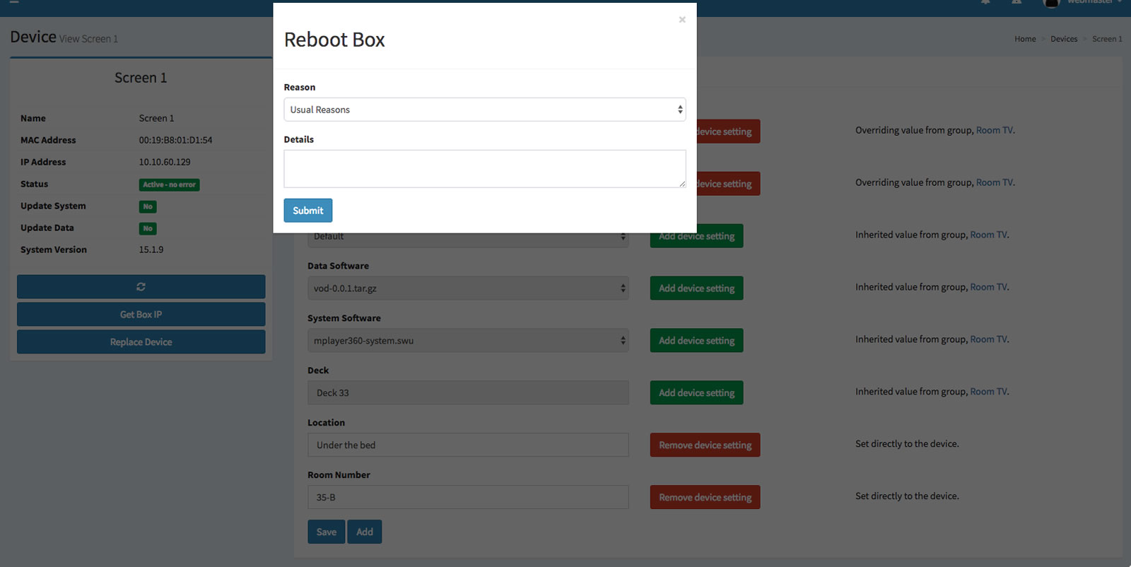 You can also reboot a device while viewing its details. To view a device's details, find it in the device list and click on the corresponding icon in the Actions column. You will be taken to the device's detail view page: