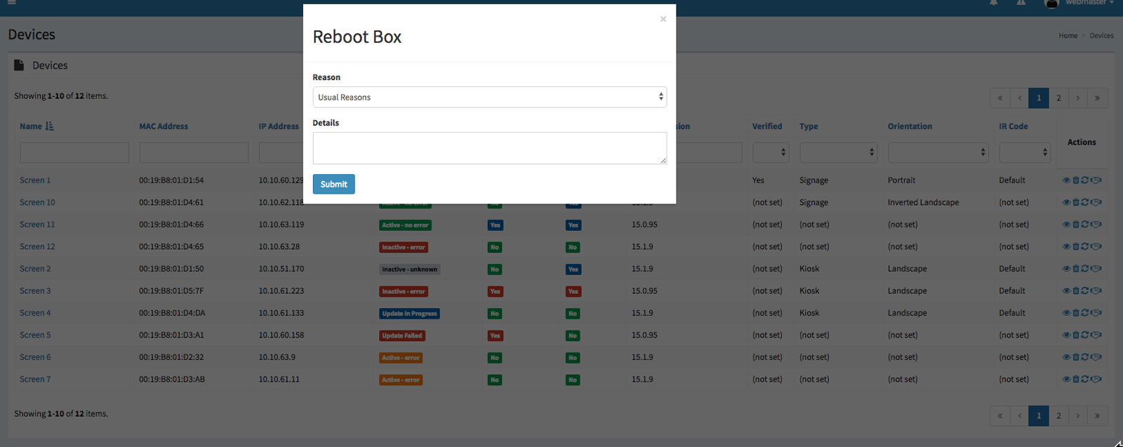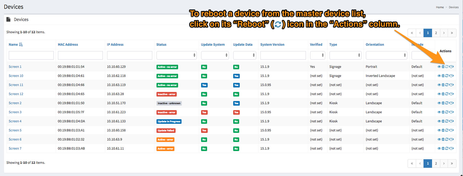 The simplest way to reboot a device is to find it in the device list (select Devices → Manage) and click on the corresponding icon in the Actions column: