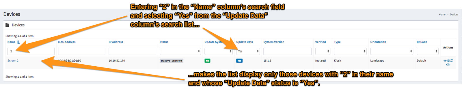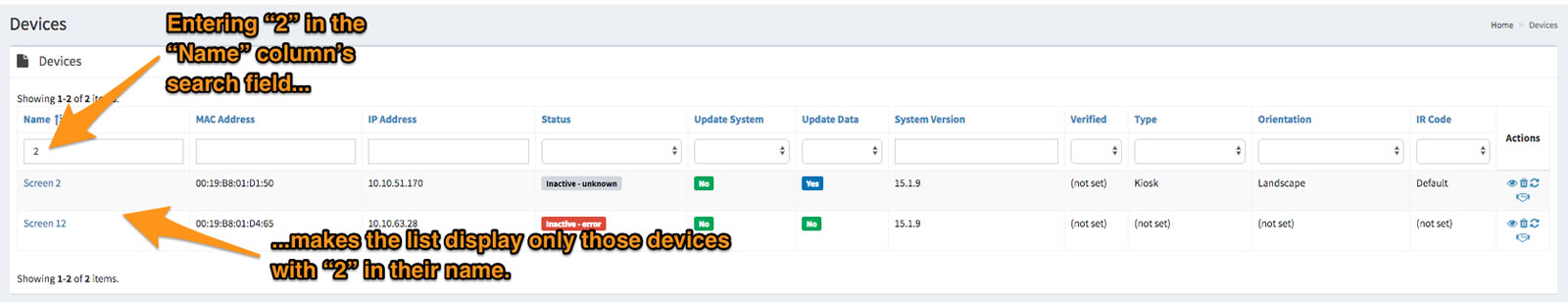 The search fields at the top of the device list's columns allow you to set the list so that it shows only those devices that match the criteria you provide.
