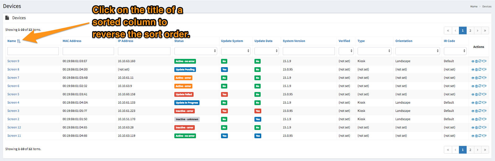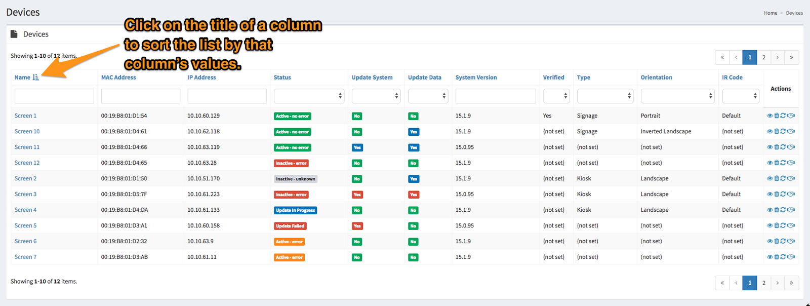 To sort the list of devices by a specific column's values, click on the title for that column. The list will be sorted by that column's values in increasing order. To reverse the sort order, click on the title for that column again.
