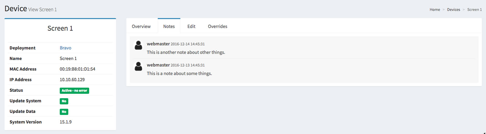To view devices, select Devices → Manage from the left column menu. This will display the master list of devices: