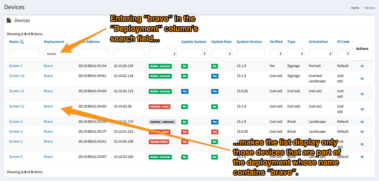 For example, to show only those devices that are part of deployments whose name contains the word “bravo”, enter bravo into the search field at the top of the Deployment column, and press the Enter key: