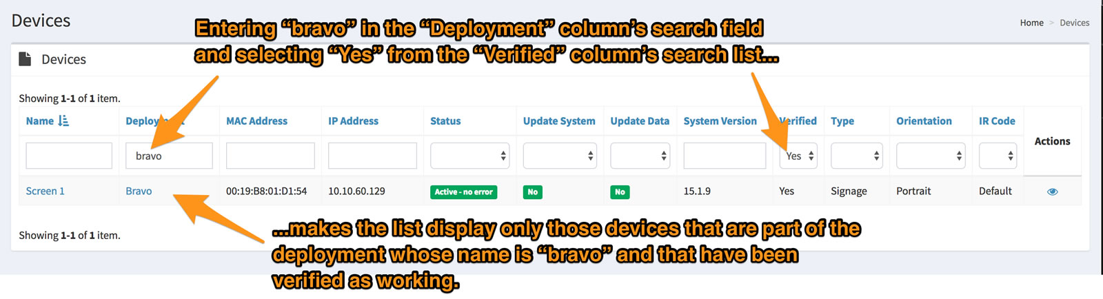 For example, to show only those devices that are part of deployments whose name contains the word “bravo” and have been verified, enter bravo into the search field at the top of the Deployment column, select Yes from the search field at the top of the Verified column, and press the Enter key: