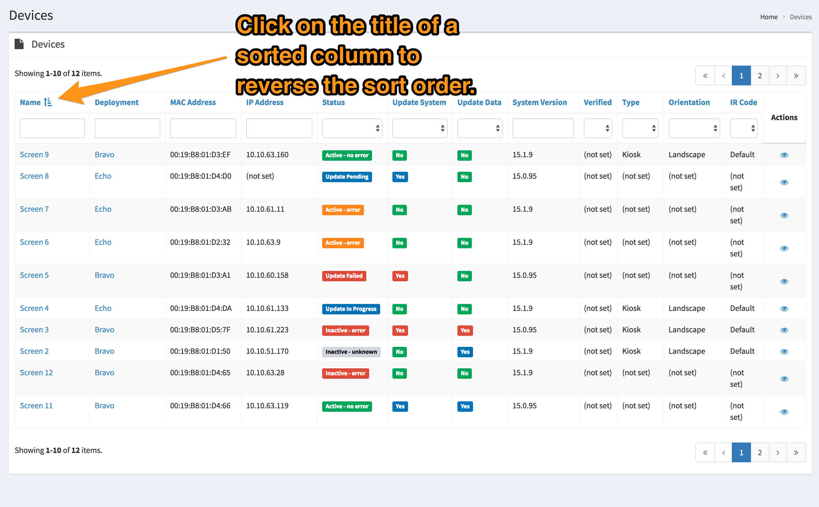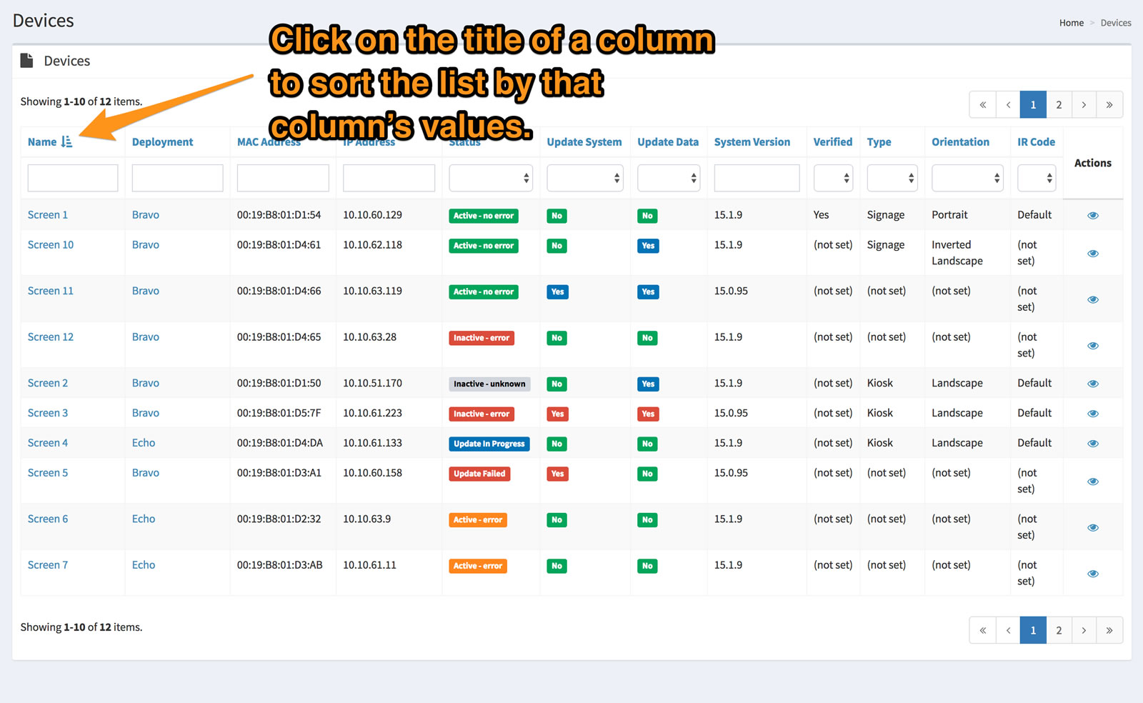 To sort a the list of devices by a specific column's values, click on the title for that column. The list will be sorted by that column's values in increasing order. To reverse the sort order, click on the title for that column again.
