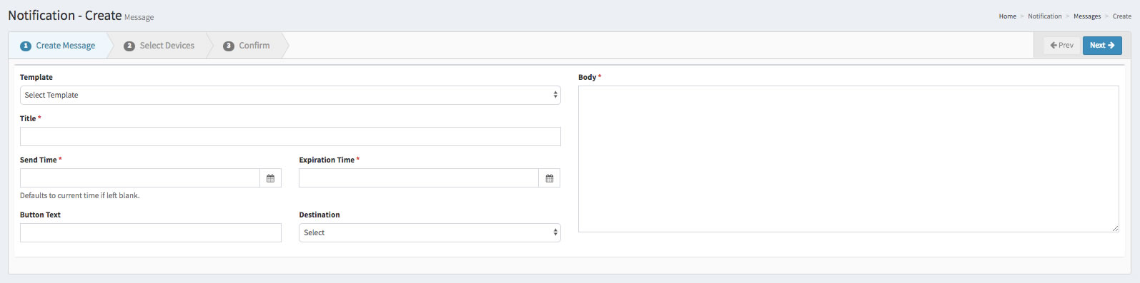 Click the Next button to proceed to the next step. The Select Devices tab of the new message process will appear: