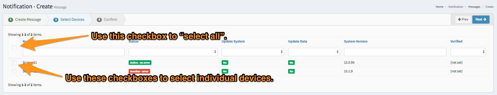 Use the checkboxes on the left side of the list to select devices to which the message will be sent: