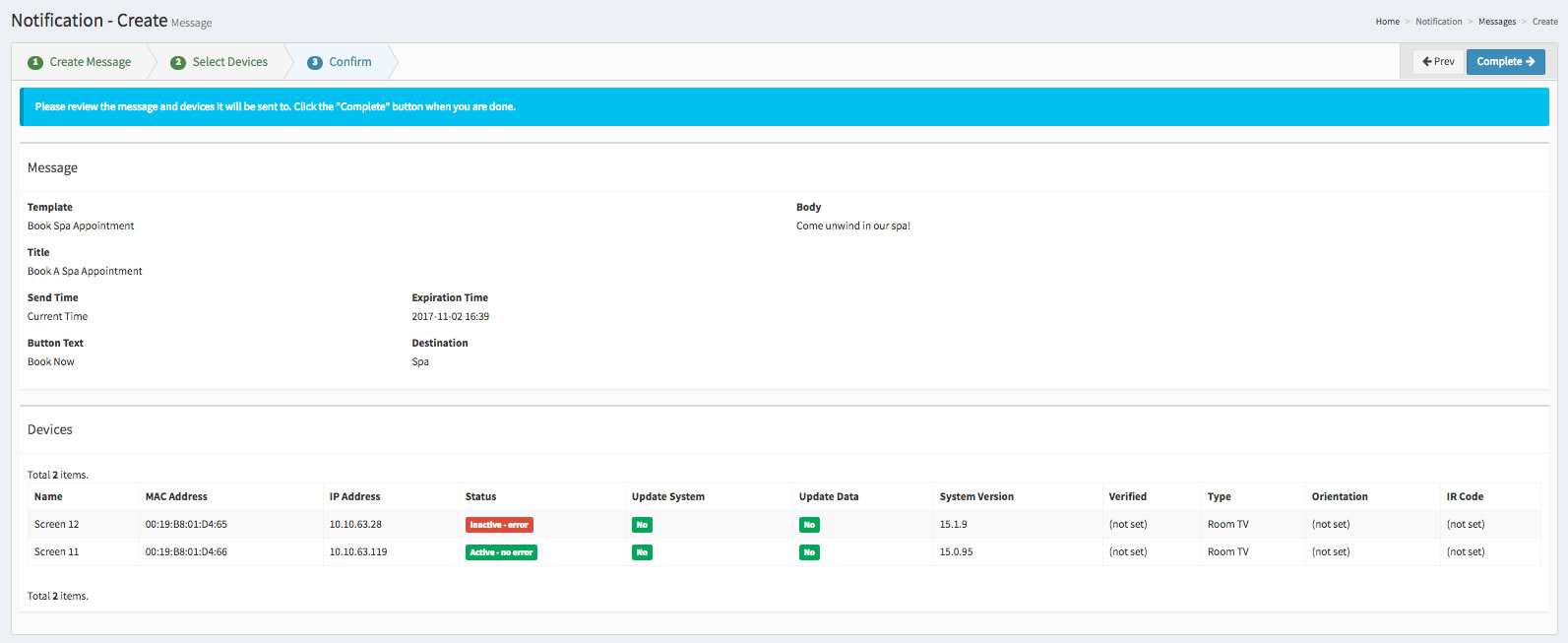 Review the information on the page. To confirm that the message should be created, click the Complete button.